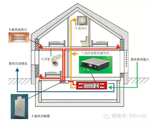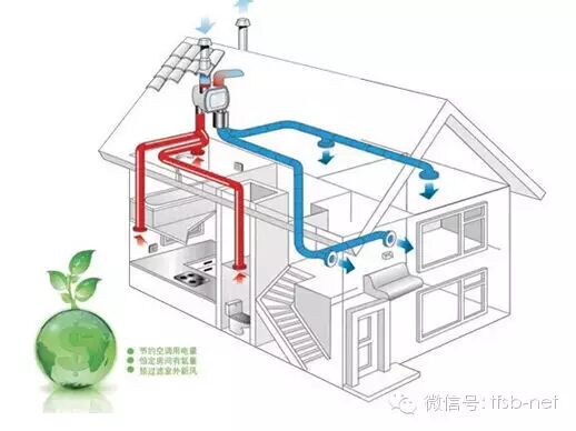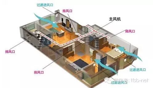 以住宅为例:排风口安装在厨房、卫生间等污浊空气聚集的地方,排风口直接与卫生间的竖井或是厨房的烟道连接,导入新风的进风口安装在卧室、客厅的门窗上方,并直接连接户外。