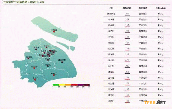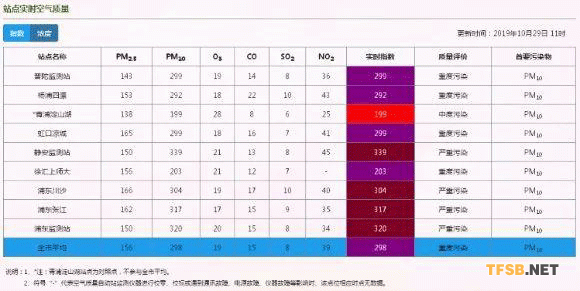 目前,浮尘影响还在持续。11时,静安监测站的实时空气质量指数为339,浦东监测站为320,浦东张江监测点为317,浦东川沙监测点为304,实时指数目前显示最好的在青浦淀山湖监测站,为199。全市10个国控点中有一半均处于重度污染状态,全市平均为298,重度污染。