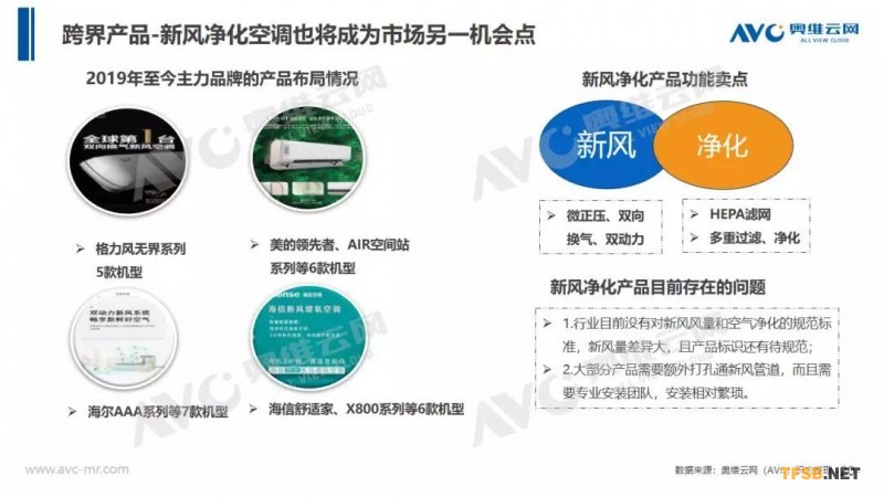 在产品层面,通过19年上市的产品我们可以发现主要集中数显可视(甲醛数显等)及功能集成(空调净化、风扇净化、暖风净化等)两大方面,跨界产品成为行业关注的热点,以新风净化空调而言,空调行业的领头企业已争先布局。