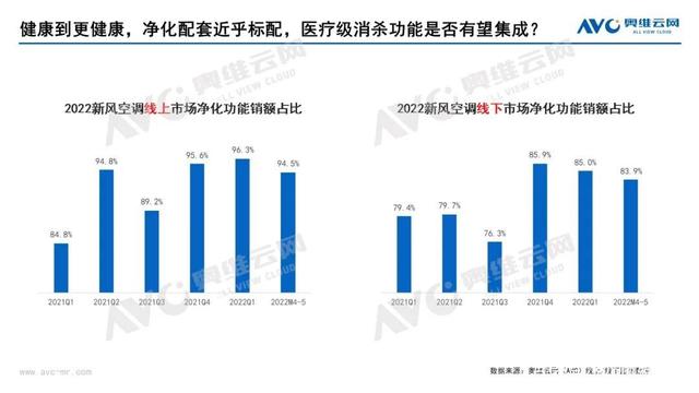 新风与净化的结合牢牢落实了健康空调的定位,在疫情常态化的今天显得尤为重要,奥维云网(AVC)数据显示,2022M4-5新风空调市场中净化功能线上渠道销额占比94.5%、线下83.9%,现如今,在净化功能近乎标配的情况下,新健康功能的集成与挖掘成了新风空调下一阶段普及的方向,消杀功能的集成,亦或是产品形态等方面的改变,是值得去思考的下一方向。