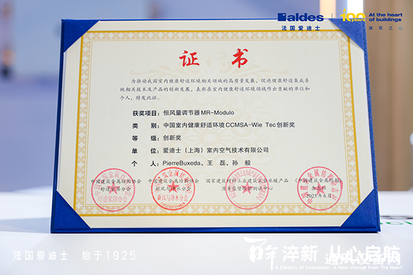 在同期召开的“2025 第四届‘好房子好部品好厨卫’高品质建筑人居环境与建材产品应用交流会”上,爱迪士恒风量MR-Modulo气流管理解决方案获得2024-2025年度中国室内健康舒适环境CCMSA-Wie Tec创新奖。