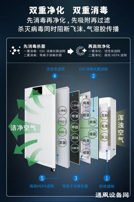 初效过滤、中高效过滤、静电吸附过滤:有效去除空气中的微粒、尘埃。活性炭网:除臭的功能。光触媒抗菌网辅助消毒。一般是用纳米级的光触媒材料(主要是二氧化钛),配合紫光灯的照射,在二氧化钛的表面产生带正电的"空穴"和带负电的负氧离子,"空穴"和空气中的水蒸气相结合。产生强碱性的"氢氧自由基",它分解空气中的甲醛和苯,使之变为无害的水和二氧化碳。负氧离子和空气中氧结合,形成"活性氧",能分解细菌的细胞膜和氧化病毒的蛋白质,从而达到杀菌、灭毒和分解有害气体的目的。