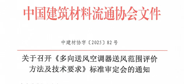 根据中国建筑材料流通协会《关于邀请参加〈多向送风空调器送风范围评价方法及技术要求〉编制的通知》等文件要求,由中国建筑材料流通协会归口管理,海信空调有限公司牵头起草的《多向送风空调器送风范围评价方法及技术要求》标准在广泛征求意见的基础上,已完成送审稿。经研究,我会定于9月29日召开标准审定会。敬请届时出席会议,现将有关事项通知如下:
